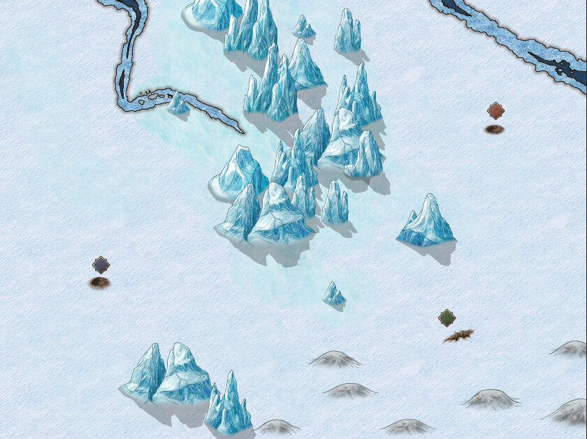 Set somewhat close to a mostly frozen inland river, Saint Larksfield (blue), New Aspen (green) and Tsargrad (red) are fairly far apart. The journey between each city lasting roughly a week give or take due to the harsh landscape and jagged icy formations. The tallest of which forming a ridgeline and almost like a shield against winter storms and their harsh winds.