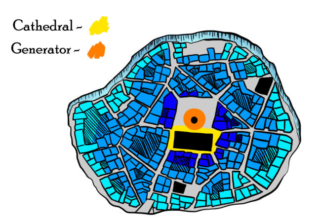 Seated within the inner circle alongside the housing of the priests is a large and beautifully maintained smaller cathedral. Stained glass reflects brightly in the generator’s warm light and the proximity makes evening prayers incentivizing for the average citizen. This is also the home of Prophet Aurora and the heir, Tobias.